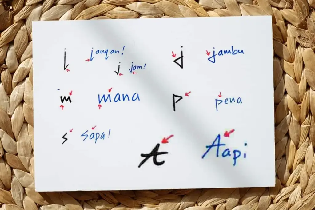 Begitu juga dengan sudut-sudut yang ditemukan di berbagai huruf. Unik dan menarik. Huruf-huruf yang menyudut memiliki arti yang berbeda-beda. Contoh huruf yang menyudut di antaranya, yaitu huruf j, m, p, s, t, dan lain-lain. Anda akan mempelajarinya lengkap … a sampai z !