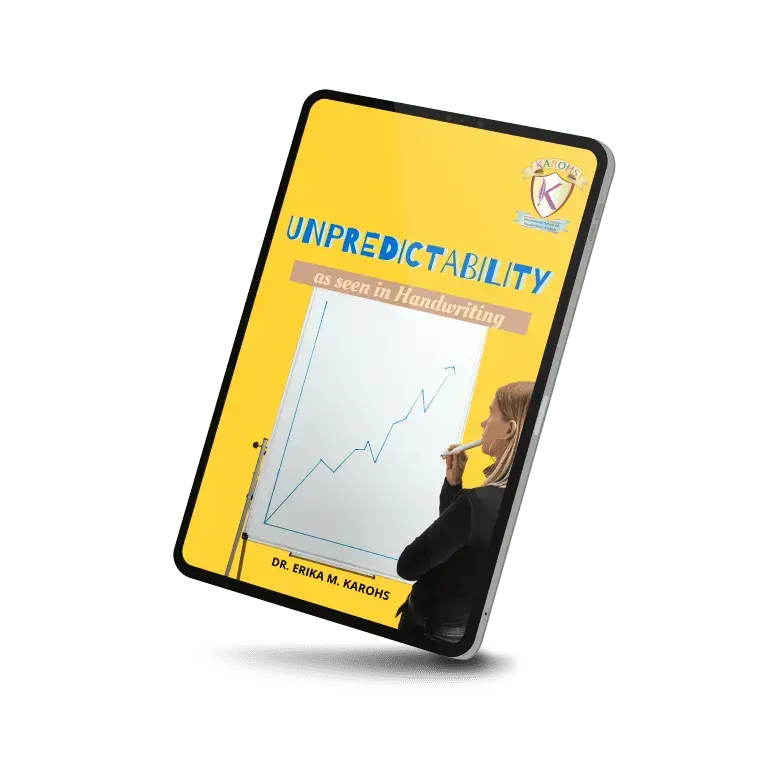 Unpredictability as seen in Handwriting merupakan sebuah e-book yang ditulis oleh Dr.Erika M.Karohs. E-book ini berisi tentang ketidakpastian dalam penulisan tangan. ketidakpastian ini terjadi karena tulisan tangan secara emosional belum matang, memiliki self-discipline yang buruk serta masih terpacu pada moods dan presents.